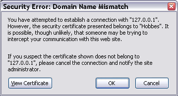 In the examples I’ve set the name of the machine to Hobbes, which happens to be the name of my machine. It’s extremely unlikely your machine is called Hobbes. So if you run the SSL example on your computer you’ll also see another error when you open the site in your browser.