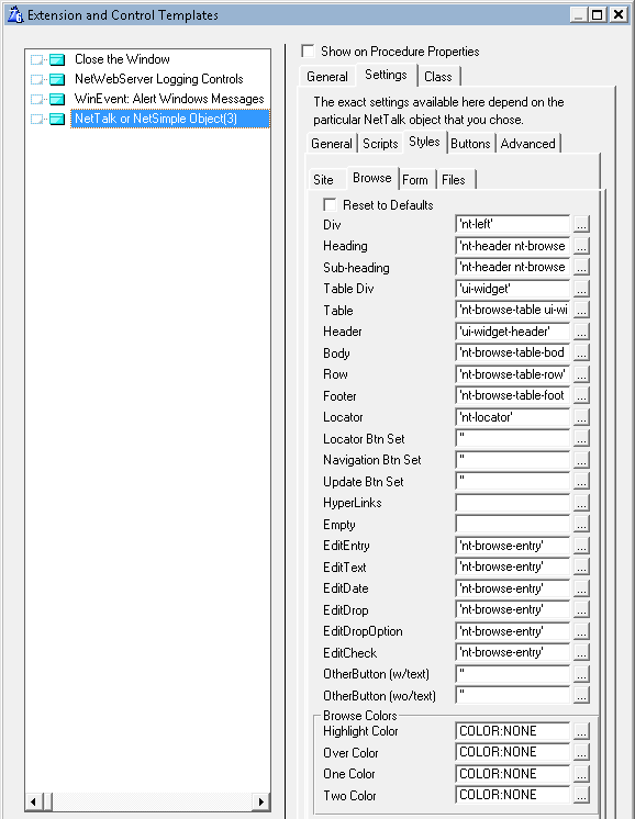 The Styles tab contains the default style to be used for each part of your application. At the local (procedure) level you can augment these settings, by adding additional styles, or override the styles altogether. However setting the global styles is very powerful in NetTalk 6. By setting the styles here, it is possible to change the look of all the procedures in the app, at the same time.