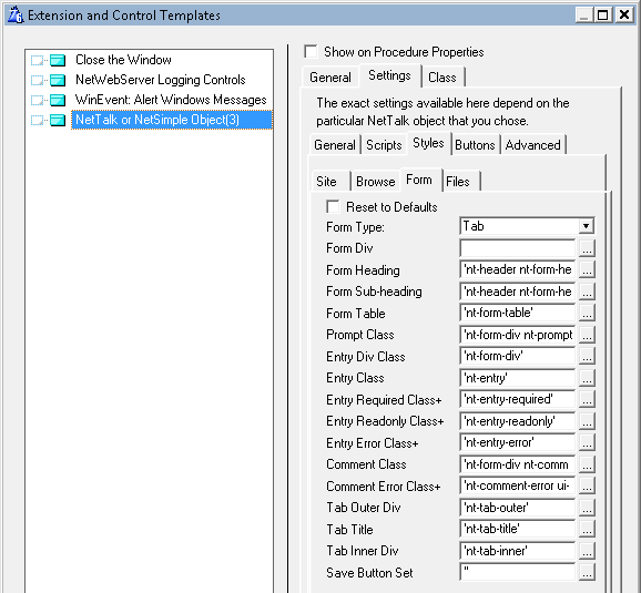 Form Type: There are different Form Types within the NetTalk family, and these broadly determine the way that tabs on your forms will look and behave. The default you set here should be the style you want to use for "most of" the forms in your system. At the form level this setting can be overridden for specific cases. For a good example of all the different tab types currently supported see the Tabs (57) example.